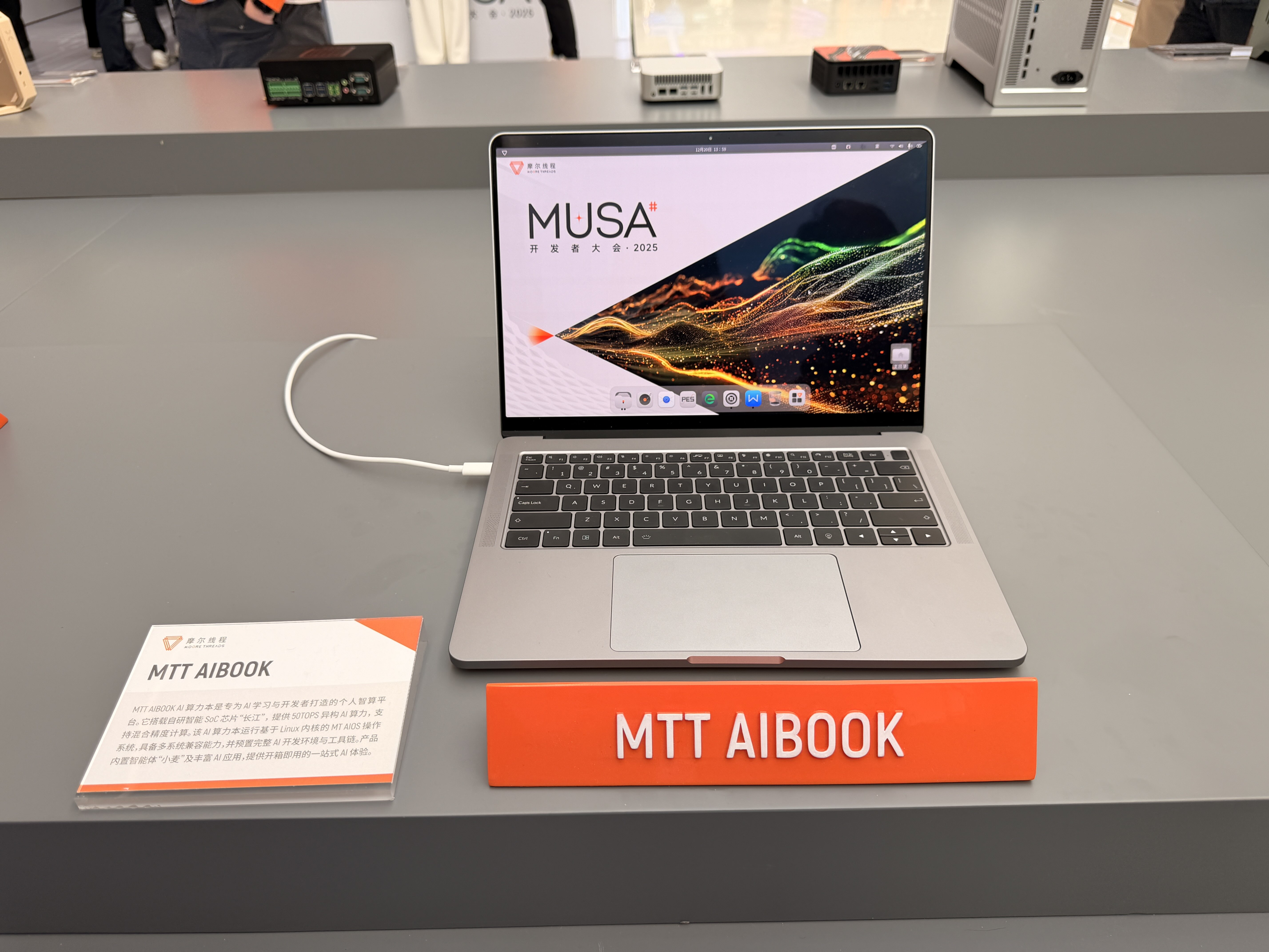 摩尔线程这次还发布了一款面向开发者的AI算力笔记本MTT AIBOOK。该笔记本搭载摩尔线程自主研发的智能SoC芯片“长江”,提供50 TOPS异构AI算力,支持混合精度计算,运行基于Linux内核的MT AIOS操作系统,具备多系统兼容能力,预置完整AI开发环境与工具链。