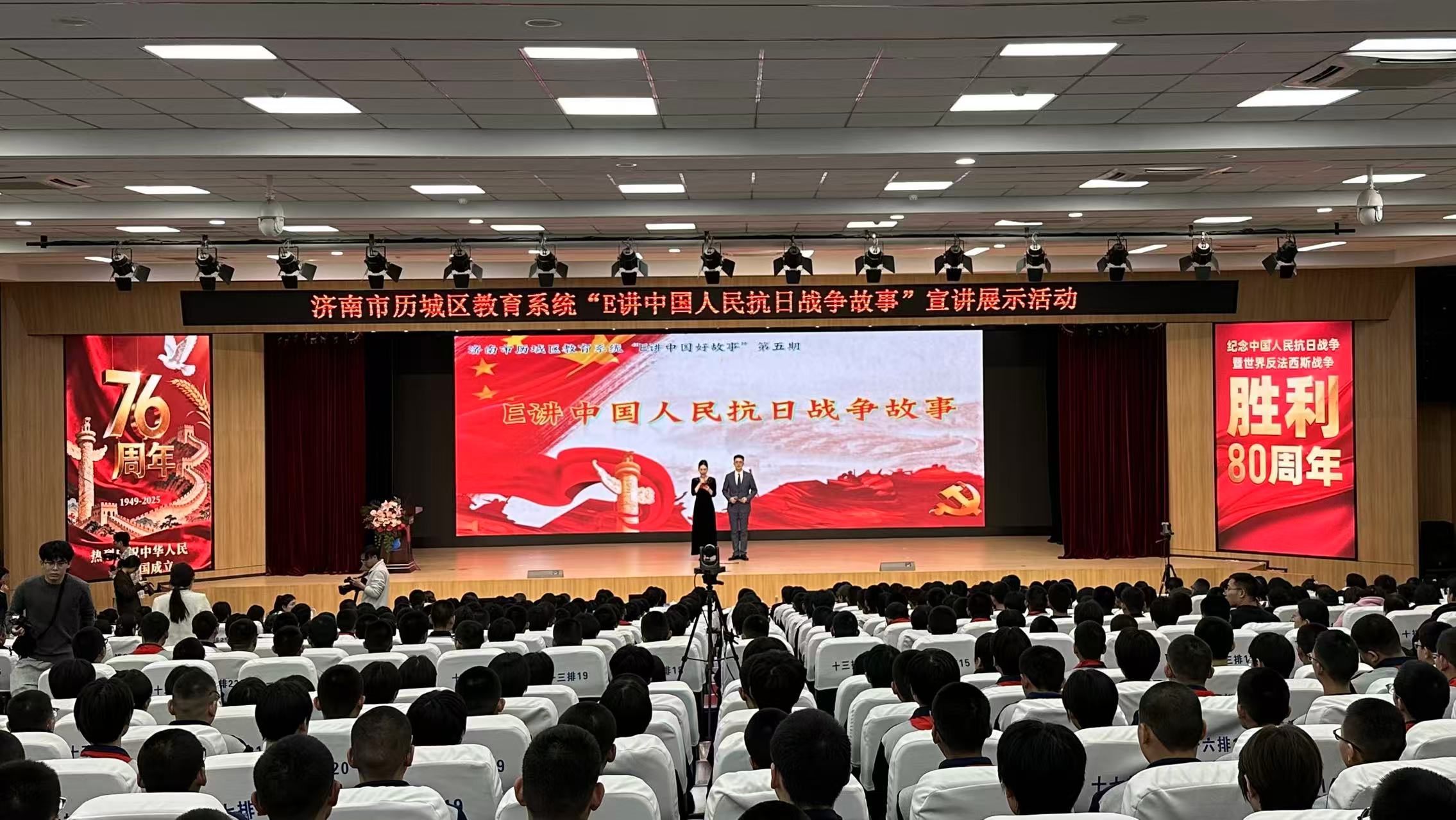 为纪念中国人民抗日战争胜利80周年,铭记历史、缅怀先烈、传承红色基因、激扬爱国情怀,12月18日,济南市历城区教育系统“E讲中国好故事”第五期——“E讲中国人民抗日战争的故事”专题宣讲活动在历城区华山第二中学举行,全区300余名英语教师、400余名学生参与活动。
