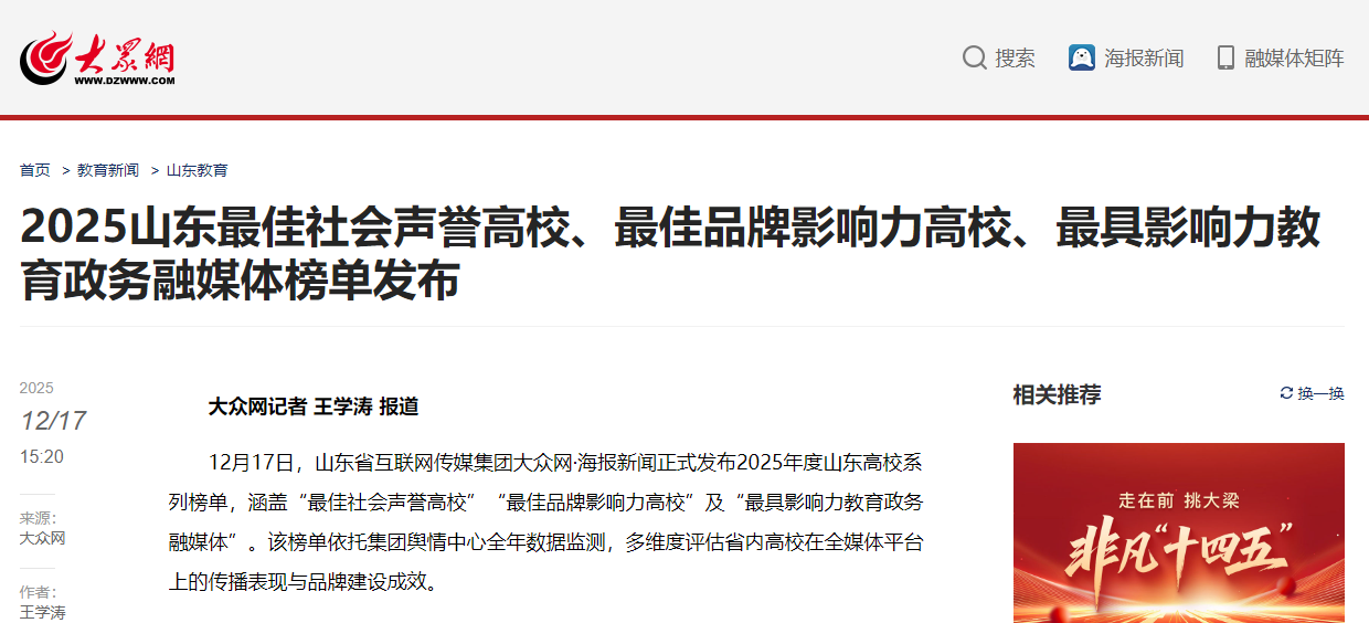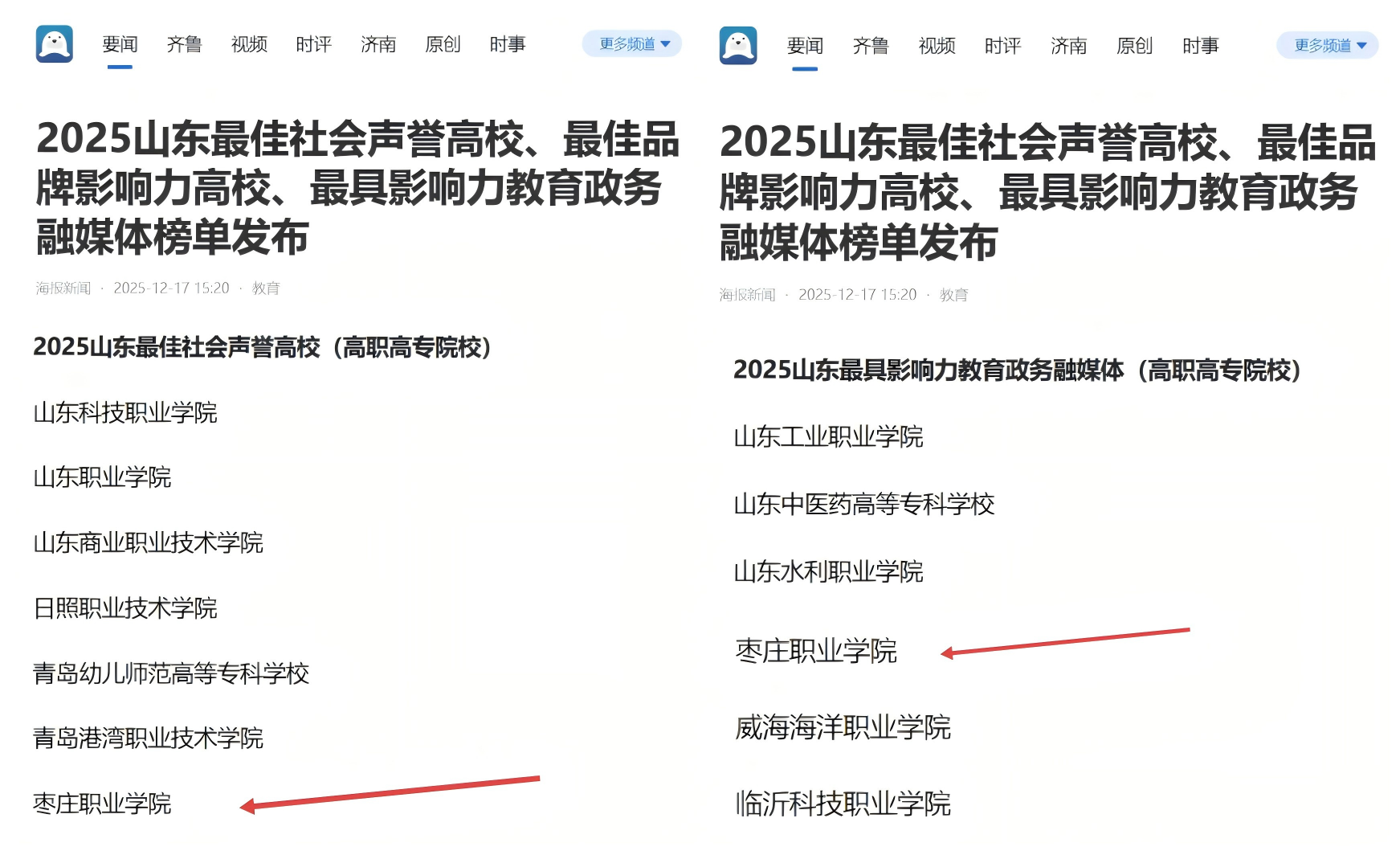 12月17日,山东省互联网传媒集团大众网·海报新闻正式发布2025年度山东高校系列榜单,枣庄职业学院荣获2025山东“最佳社会声誉高校”“最具影响力教育政务融媒体”两项荣誉。
