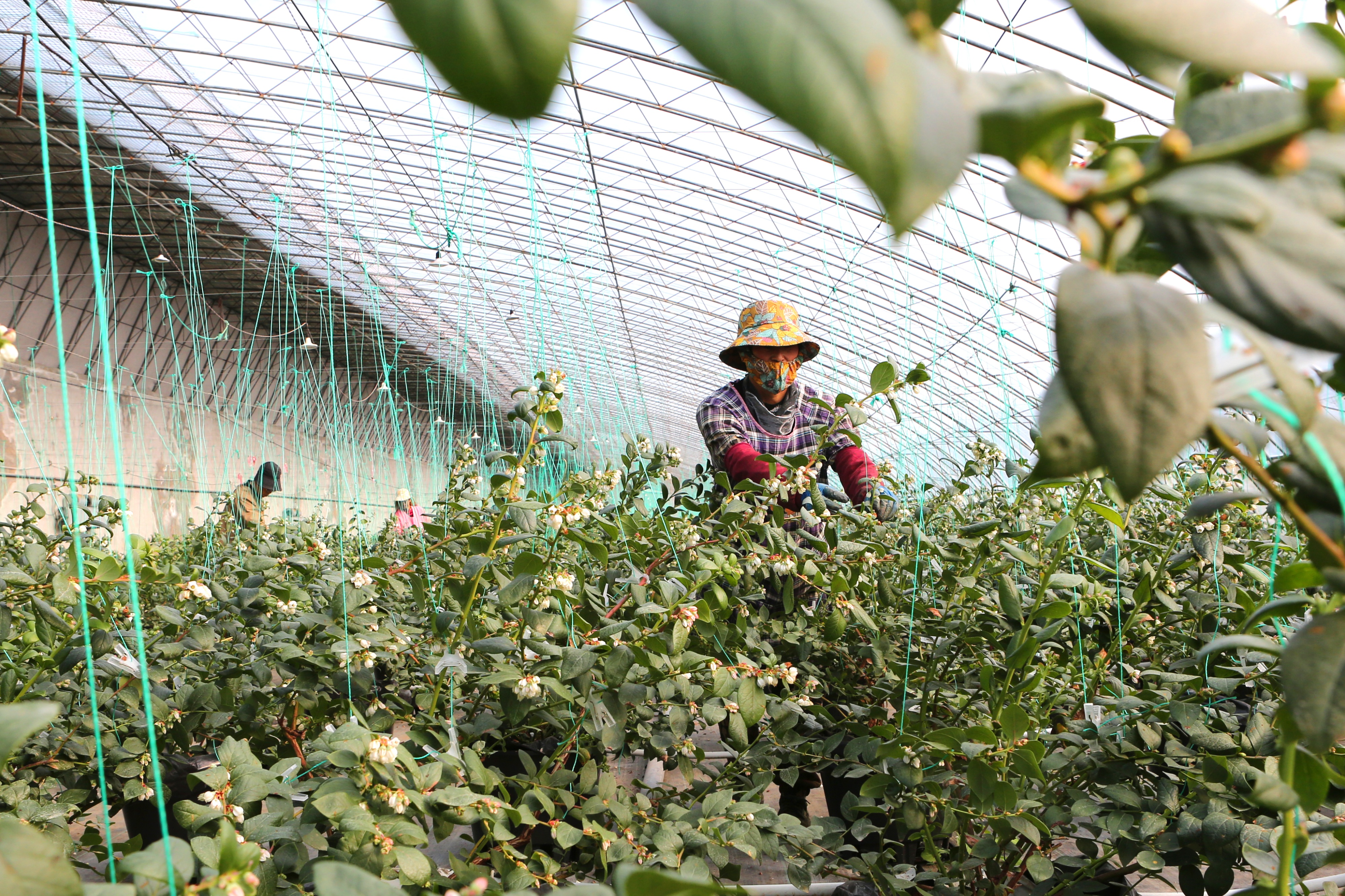 在文登区侯家镇的运恒农业生态园的蓝莓种植大棚内工人为即将挂果的蓝莓疏花近年来山东省威海市文登区通过引进农业新品种新技术积极发展集采摘观光于一体的冬季设施农业种植猫冬农闲变成了红火的冬忙在优化市场供给的同时增加了农民的收入陈宏青郭彦成