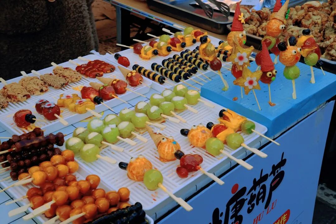 最受孩子欢迎的,当属糖葫芦摊。这里的糖葫芦可不寻常,有的是憨态可掬的稻草人模样,糖壳晶亮,让人捧着端详半天才舍得下口;还有的点缀着小巧糖花,仿佛把冬日里的甜都凝在了竹签上。
