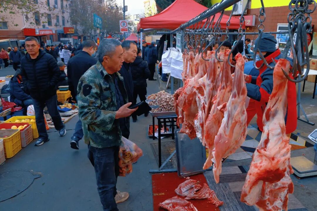肉食区同样热闹,新鲜的牛羊肉挂在架上,带着肌理分明的纹路。摊主的吆喝声中气十足,顾客们围着摊位挑选,盘算着中午的红烧羊肉、清炖羊汤……