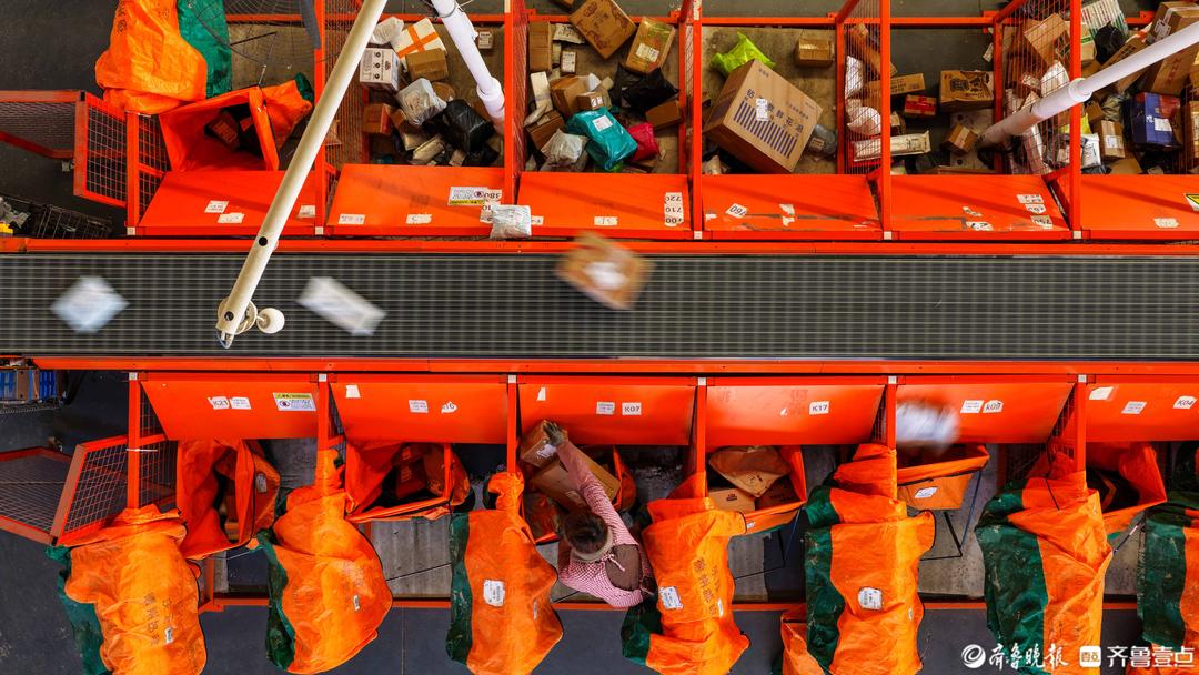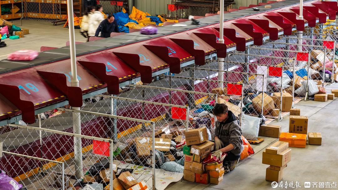12月18日,在山东省乐陵市客货邮快递物流共配中心,工作人员在智能分拣作业线上忙碌。贾鹏 摄