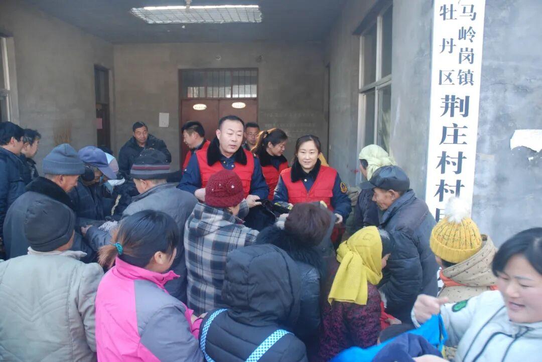 刘福山(中)组织志愿服务队员向贫困群众捐赠御寒衣物3000件。