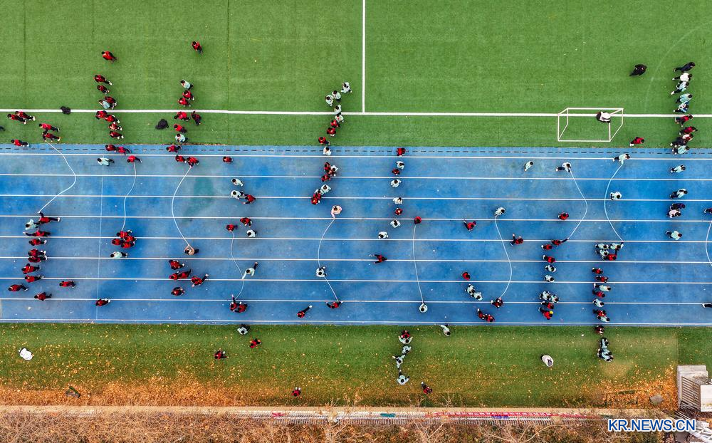 19일 라오링시의 한 초등학교 운동장에서 체육 활동을 즐기는 학생들을 드론으로 내려다봤다. 2025.12.19
