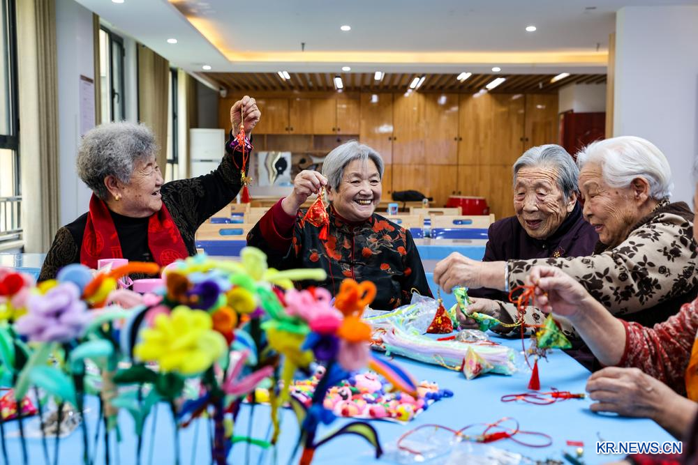 19일 산둥(山東)성 라오링(樂陵)시의 한 아파트에서 노인들이 복주머니를 만들고 있다.