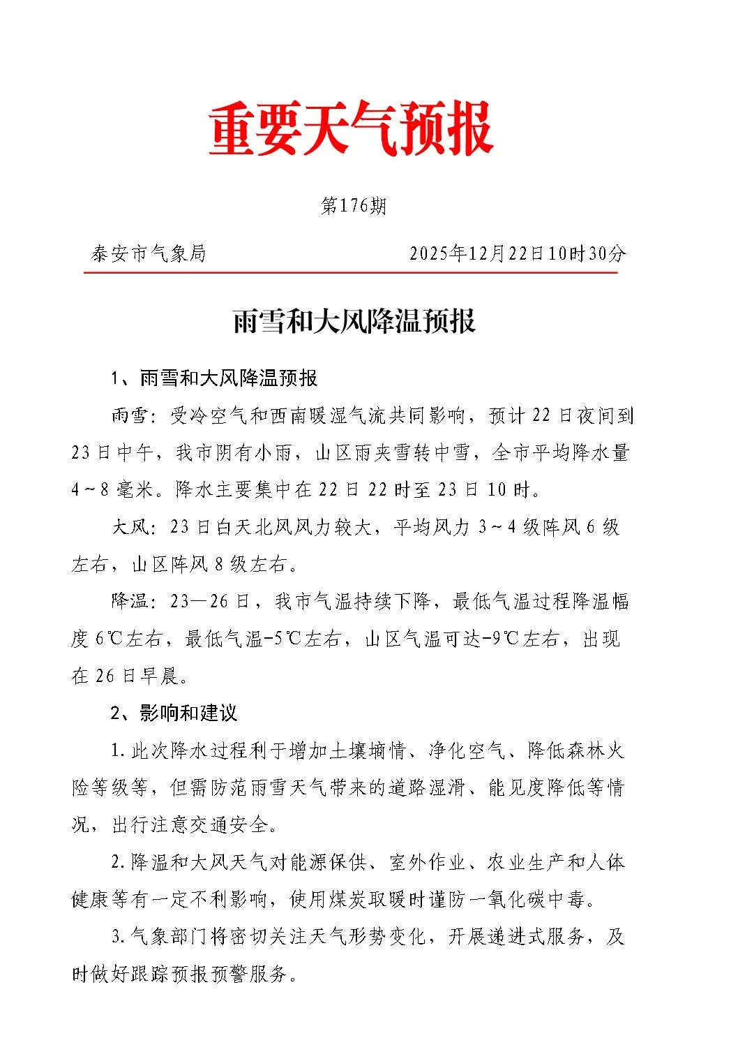 12月22日10时30分,泰安市气象局发布重要天气预报,详情如下: