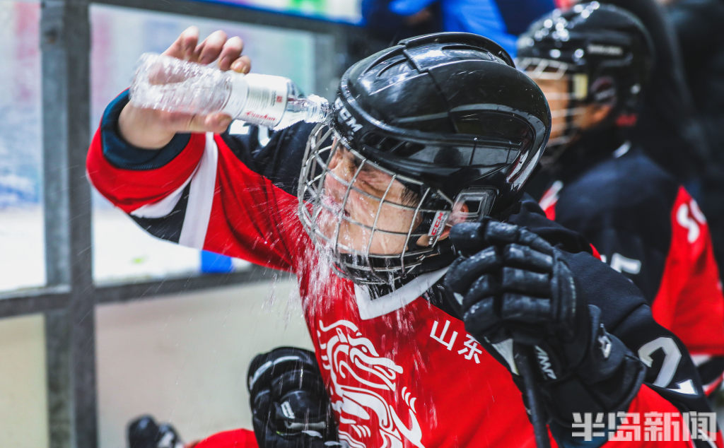 2021年6月,青岛,冰球队员在赛后用冷水降温