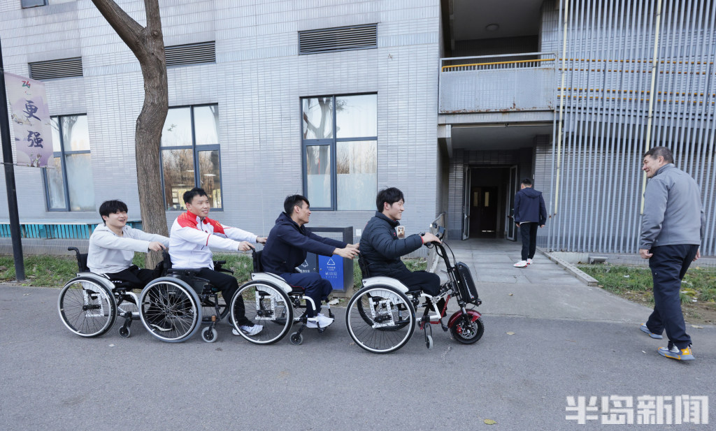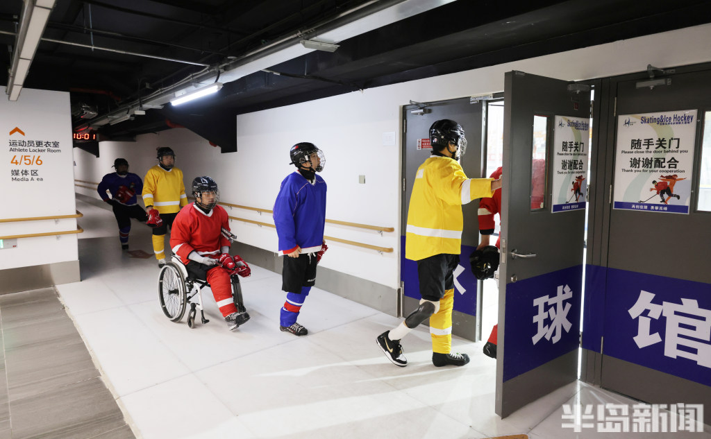 2025年11月,北京,训练结束后,冰球队员准备坐上轮椅