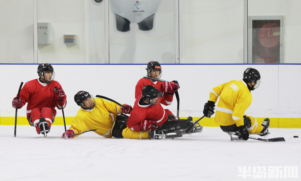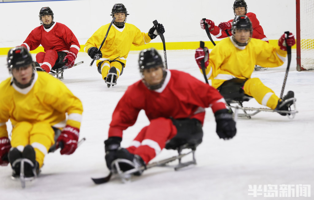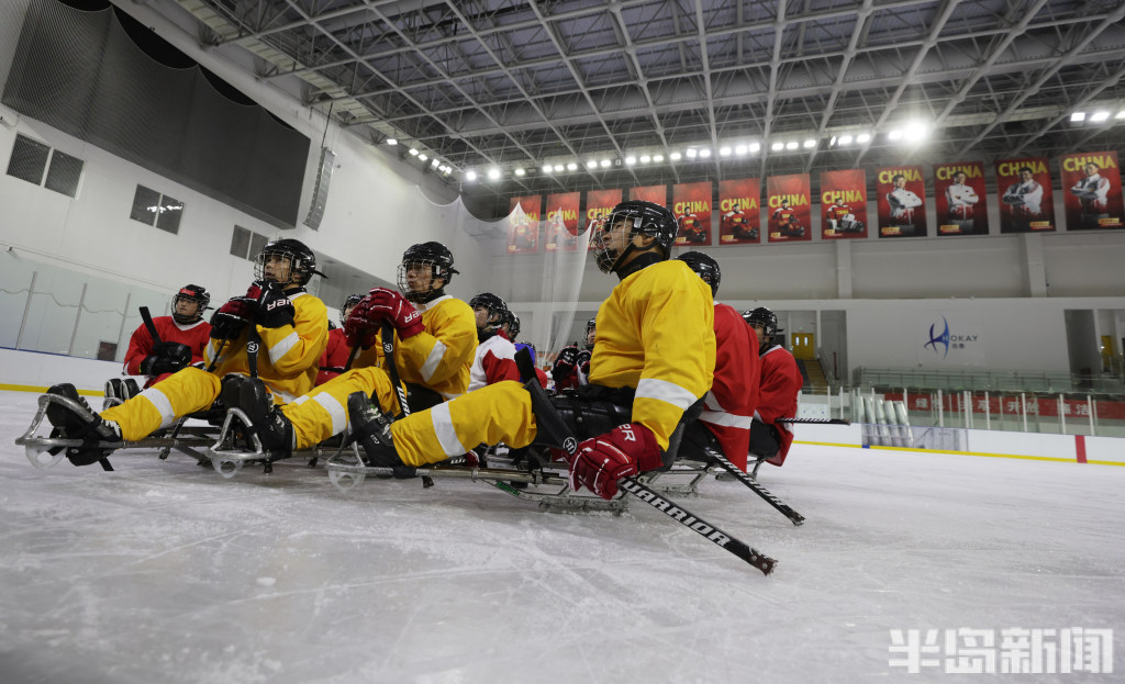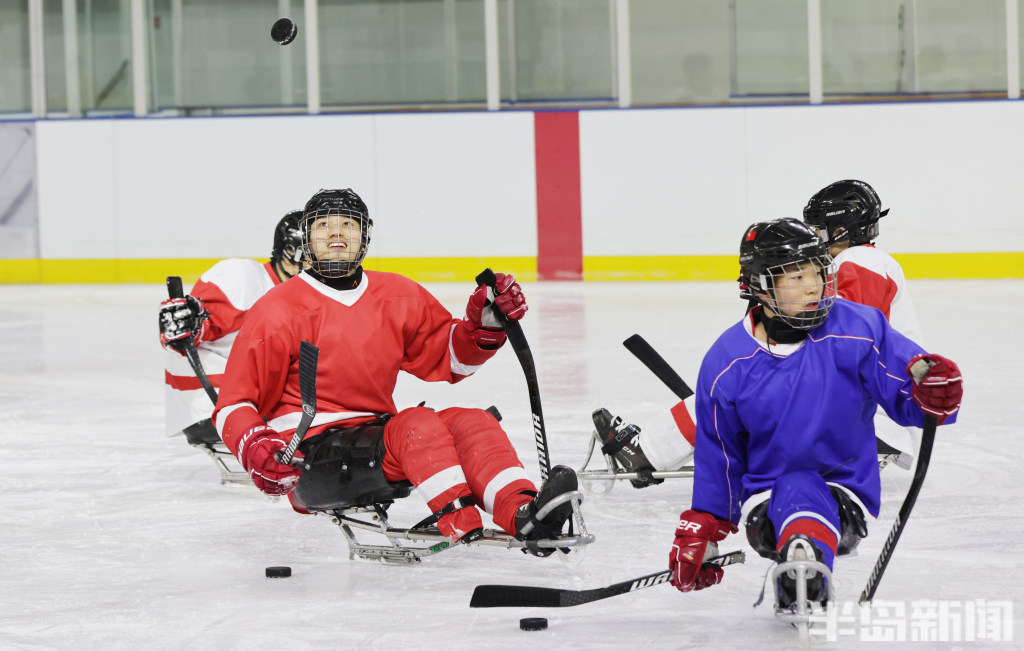 2025年11月,北京,中国冬残奥冰球队员在冰上训练