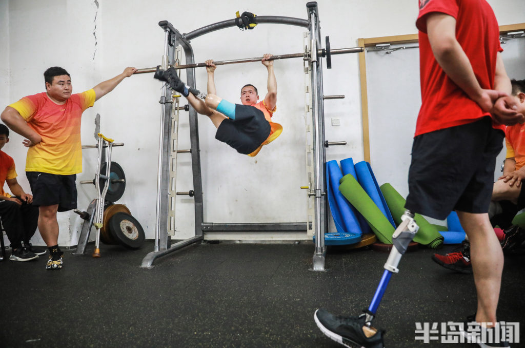 2019年8月2日,中国冬残奥会冰球队员在体能房训练