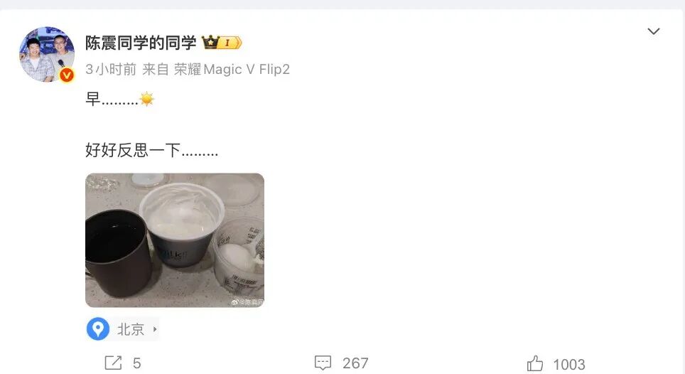 随后不久,该条微博已不可见。他在同日其它微博中曾表示要“反思”。