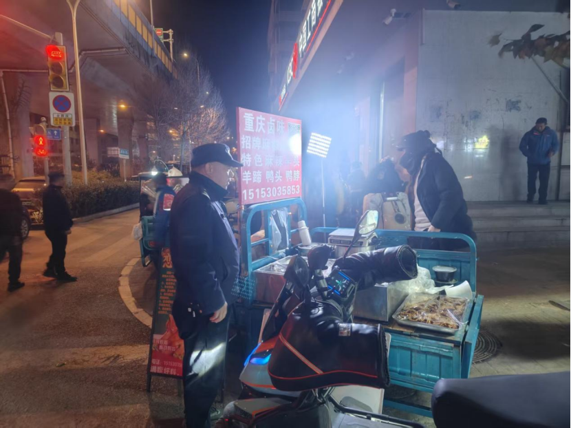结合投诉热点,街道城管委对夜间占道经营易发路段进行重点巡查,采取“延长值守时间+不定期巡查”相结合的方式,一方面,强化夜间巡查力度,延长管控时段,在重点投诉点位安排专人值守,构建全时段监管网络;另一方面,开展夜间市容秩序集中劝导,以万寿路、二环南路等区域为整治重点,通过劝导、教育、宣传相结合的方式对流动摊贩进行引导规范,明确告知占道经营存在的安全隐患,及时劝离违规摊贩。