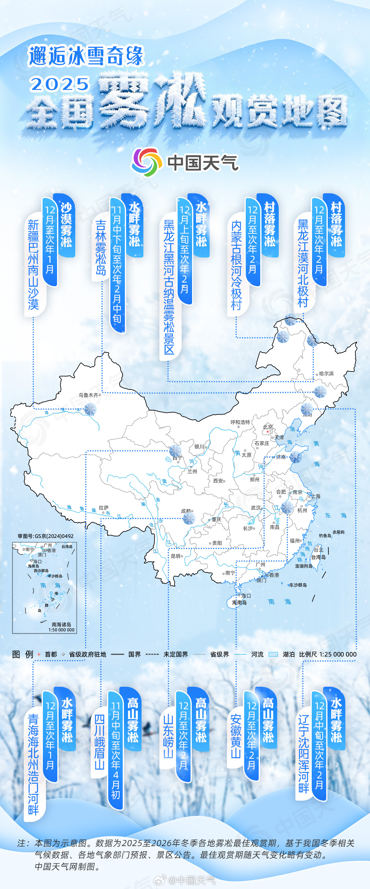 从中国天气网推出的全国雾凇观赏地图来看,雾凇景观具有明显季节性,最佳观赏期大多集中在12月至次年2月。北方冬季寒冷,雾凇分布广泛,新疆、青海、内蒙古、黑龙江、吉林、辽宁、山东等地都有它的身影。而在南方,雾凇多藏于云雾缭绕的高山之巅,如安徽黄山、四川峨眉山等地。