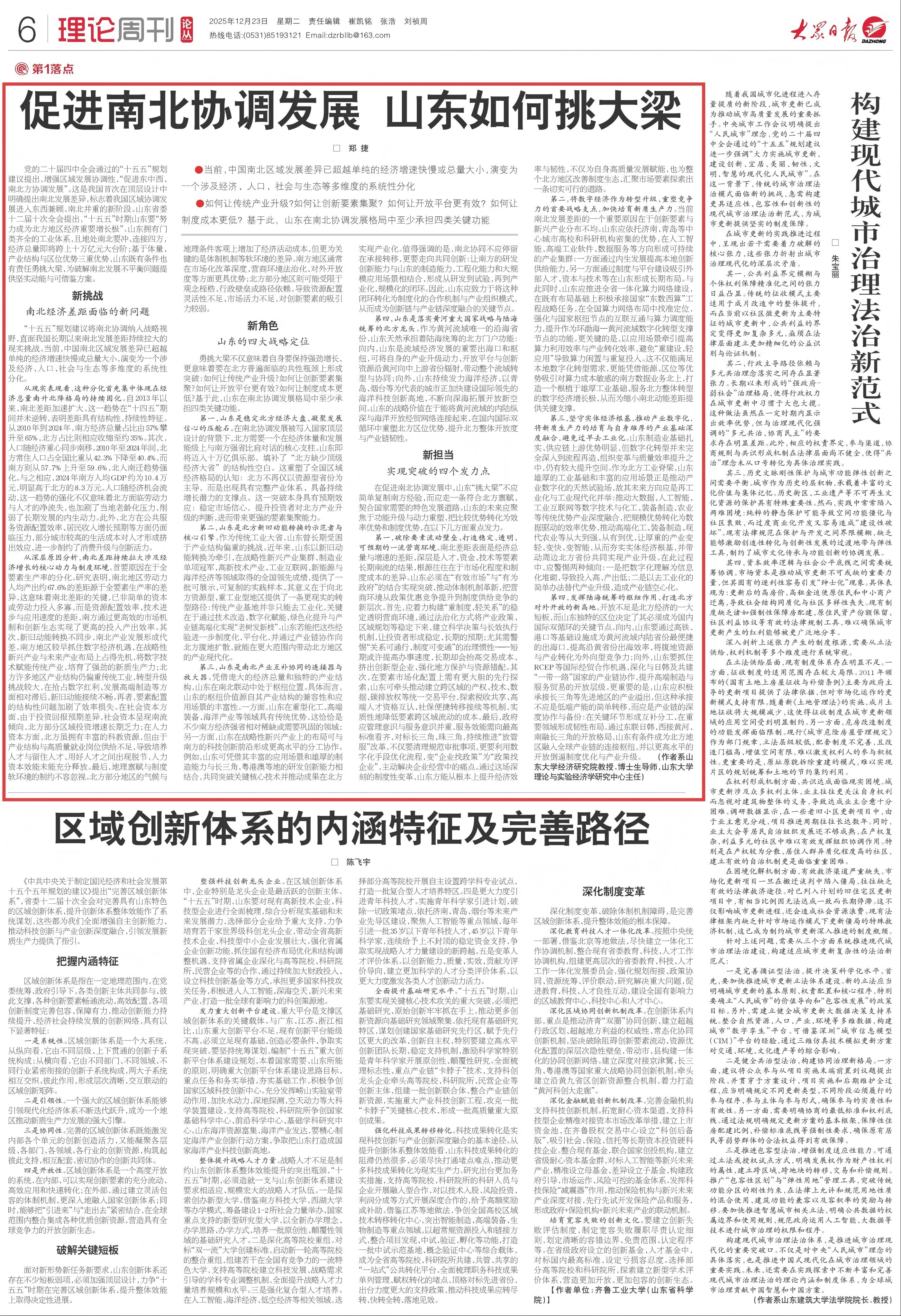 第四,发挥陆海统筹的枢纽作用,打造北方对外开放的新高地。开放不足是北方经济的一大短板,而山东独特的区位决定了其必须成为国内国际双循环的关键节点。向内,山东要通过高铁、港口等基础设施成为黄河流域内陆省份最便捷的出海口,提高沿黄省份出海效率,将腹地资源与产业转化为外向型竞争力;向外,山东要抓住RCEP等国际经贸合作机遇,深化与日韩及共建“一带一路”国家的产业链协作,提升高端制造与服务贸易的开放层级。更重要的是,山东应积极承接长三角等先进地区的产业溢出,但这种承接不应是低端产能的简单转移,而应是产业链的深度协作与备份:在关键环节形成互补分工、在重要领域形成韧性布局。通过东联日韩、西接黄河、南融长三角的开放格局,山东有条件成为北方地区融入全球产业链的连接枢纽,并以更高水平的开放倒逼制度优化与产业升级。 (作者系山东大学经济研究院教授、博士生导师,山东大学理论与实验经济学研究中心主任)
