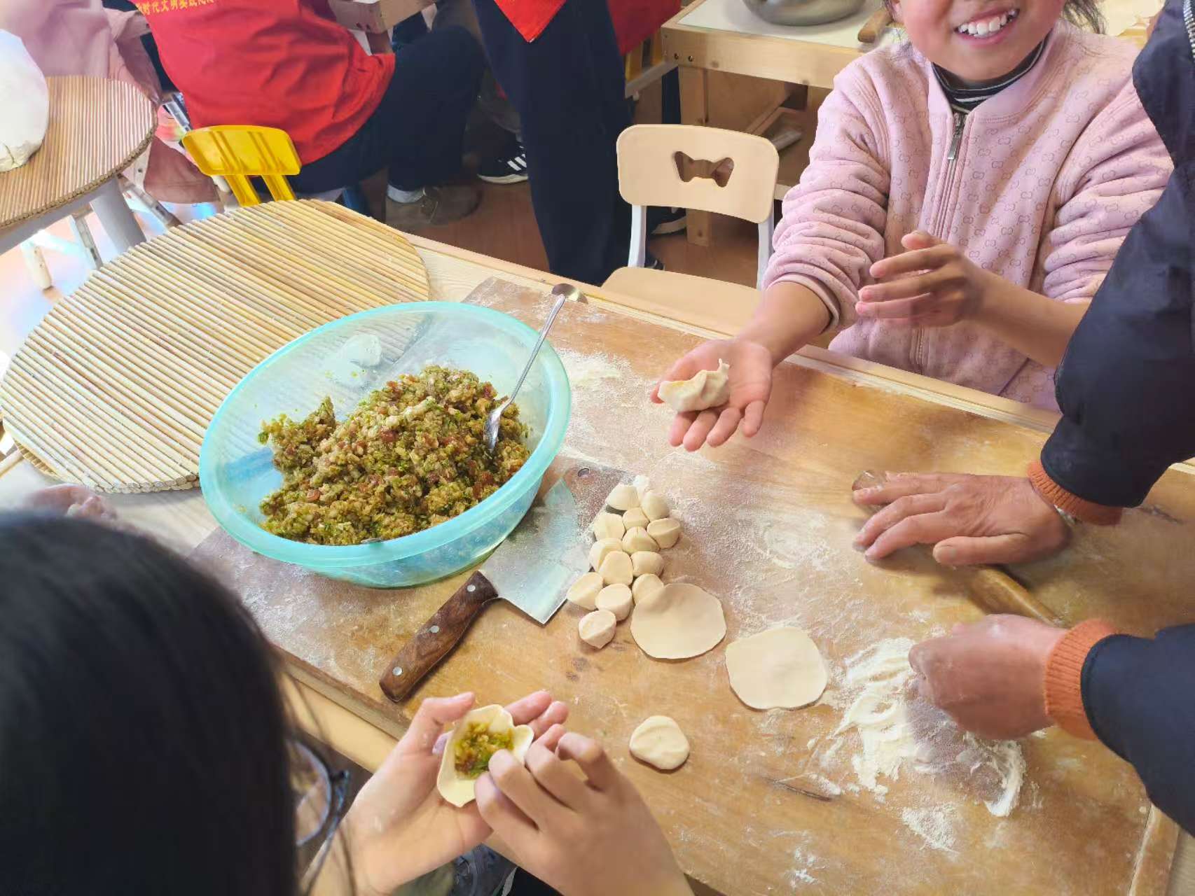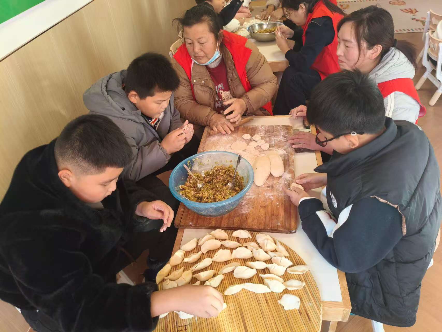理论知识学习过后,最令人期待的包饺子实践环节正式拉开帷幕。志愿者们提前准备好饺子皮、馅料等食材,手把手教孩子们擀皮、填馅、捏褶。孩子们围在桌前,小手忙个不停,有的认真模仿老师的动作,包出有模有样的饺子;有的发挥奇思妙想,创作造型独特的“创意水饺”。欢声笑语回荡在枣梦工厂的每个角落,一张张稚嫩的脸上洋溢着兴奋与喜悦。此次活动,不仅让孩子们在实践中沉浸式传承了冬至民俗文化,更在互帮互助的过程中收获了友谊与快乐,为童年时光增添了一段温馨难忘的记忆。