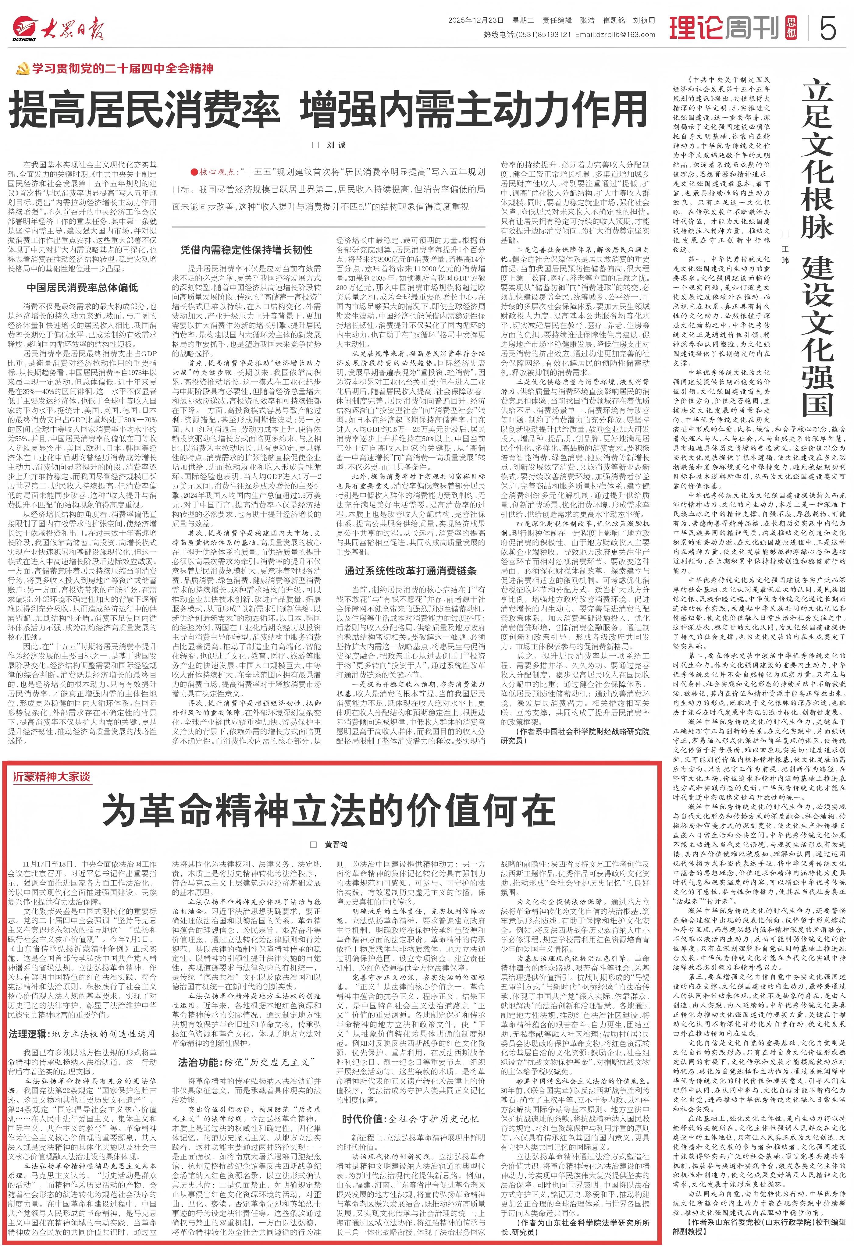 文化繁荣兴盛是中国式现代化的重要标志。党的二十届四中全会强调“坚持马克思主义在意识形态领域的指导地位”“弘扬和践行社会主义核心价值观”。今年7月1日,《山东省传承弘扬沂蒙精神条例》正式实施,这是全国首部传承弘扬中国共产党人精神谱系的省级法规。立法弘扬革命精神,作为具有鲜明中国特色的红色法治实践,符合宪法精神和法治原则,积极践行了社会主义核心价值观入法入规的基本要求,实现了对历史记忆的法律守护,彰显了法治维护中华民族宝贵精神财富的重要价值。
