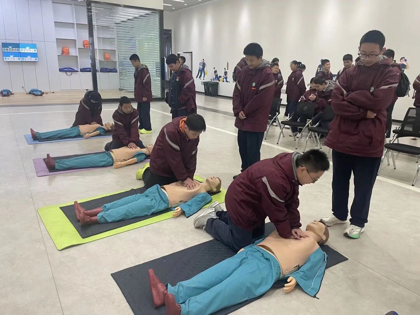 在应急救护体验中,同学们对着人体模型,按照要求,进行心肺复苏练习。当模型提示“复苏成功”时,周围响起了掌声。这掌声,是为生命喝彩。
