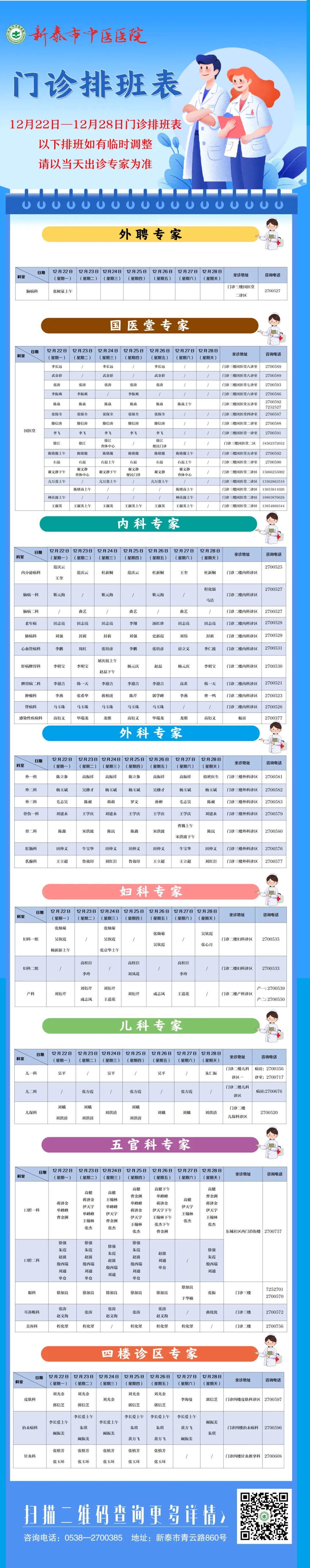 新泰市中医医院12月22日—12月28日门诊排班表来了,快来预约您心仪的专家吧~