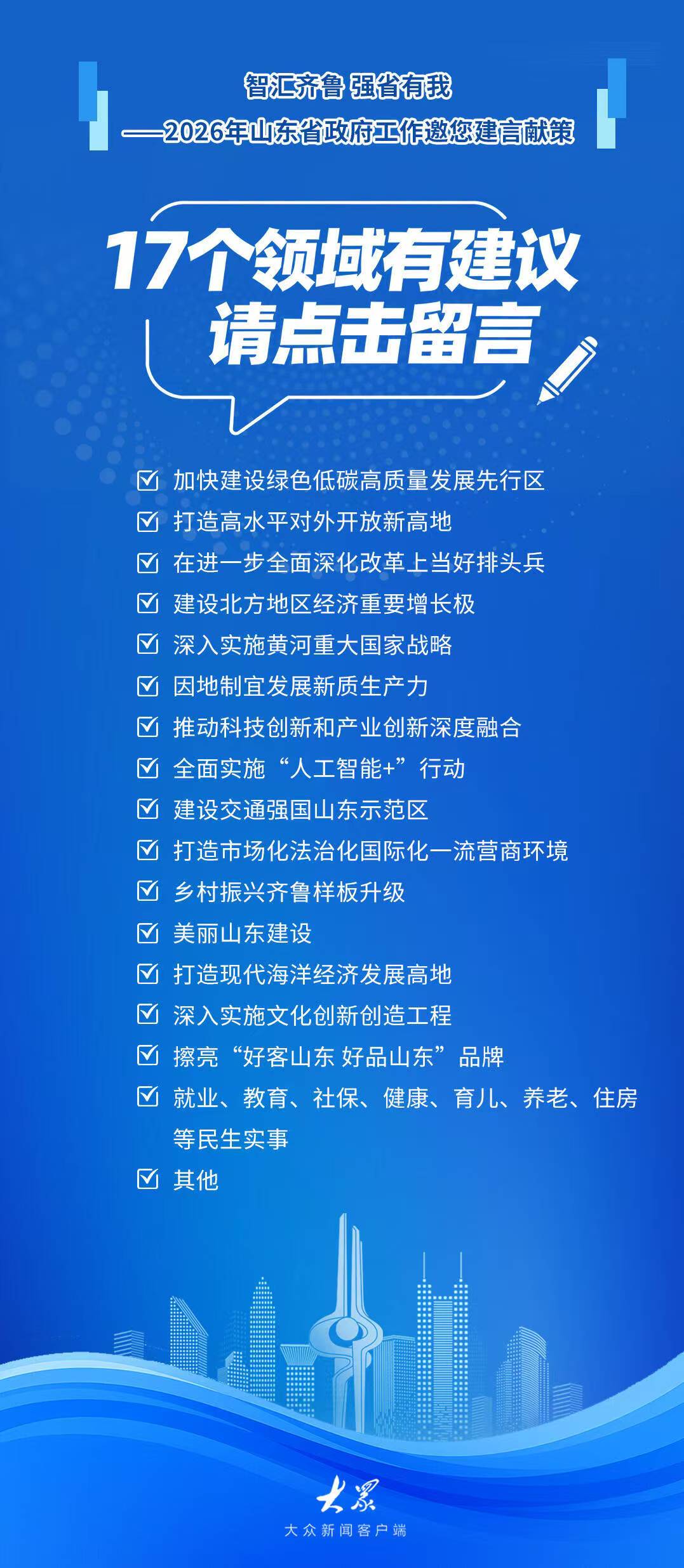 集思广益谋发展,凝心聚力开新局。2026年是“十五五”规划开局之年,山东省两会承载着全省人民对新时代社会主义现代化强省建设的共同期盼,为广泛深入地察民情、听民声、汇民智,从12月23日起至2026年山东省两会闭幕,由山东省十四届人大四次会议《政府工作报告》起草工作专班、山东省人民政府研究室主办,山东省人民政府机关政务保障中心承办,山东省人民政府网(www.shandong.gov.cn)将联合大众新闻、齐鲁晚报·齐鲁壹点、齐鲁网·闪电新闻等权威媒体平台,共同启动“智汇齐鲁 强省有我——2026年山东省政府工作邀您建言献策”活动,公开征集社会各界对山东省“十五五”时期经济社会发展和2026年政府工作的宝贵意见建议。