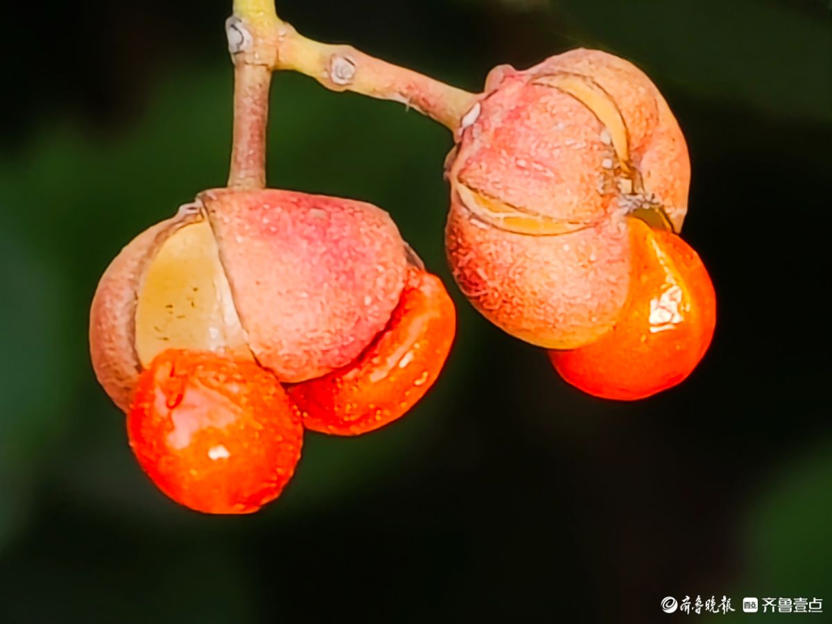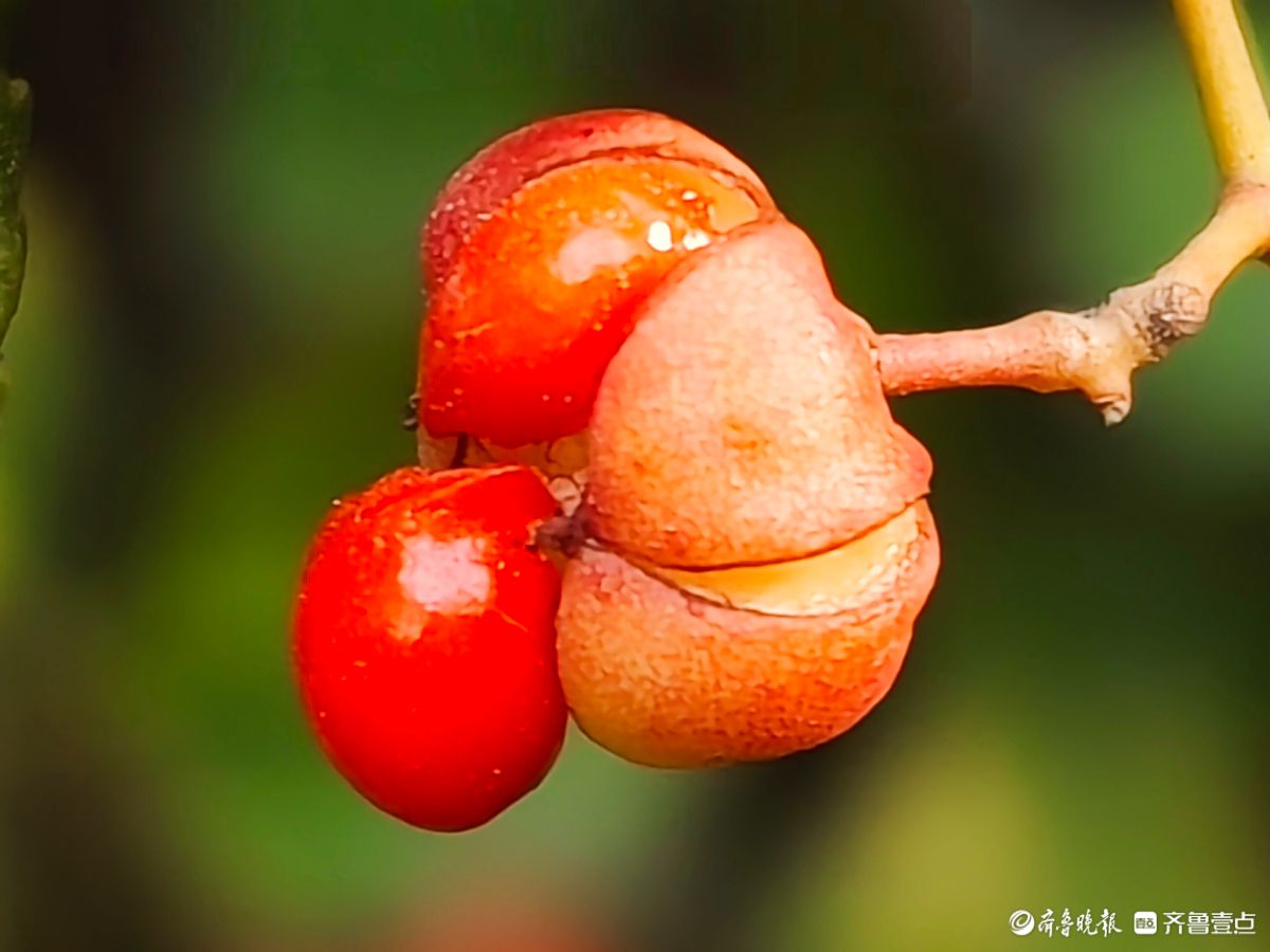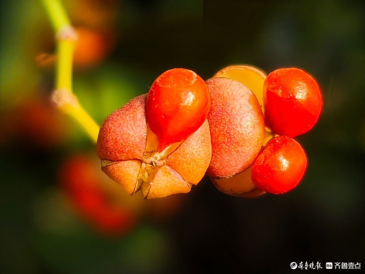 12月18日在临沂沂河新区道路两旁绿化带里冬青果实开始脱壳一个个橘红色果实脱颖而出摇摇欲坠晶莹剔透放慢脚步仔细端详这些冬青果实在翠绿的叶子衬托下颜色鲜艳如同剥开的小金桔让人垂涎欲滴高军摄