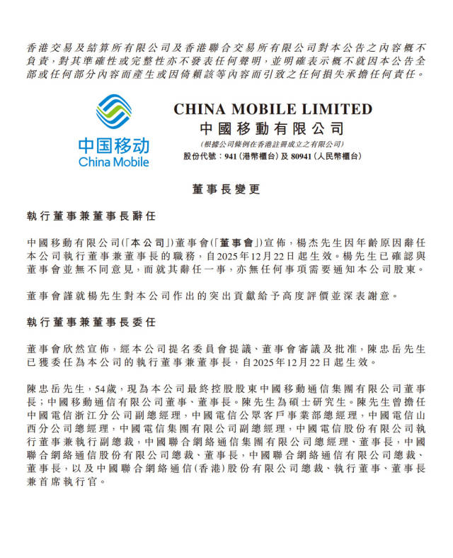 12月22日中国移动在港交所发布公告杨杰因年龄原因辞任公司执行董事兼董事长的职务自2025年12月22日起生效陈忠岳已获委任为本公司的执行董事兼董事长自2025年12月22日起生效