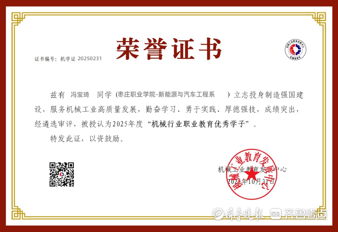 枣庄职业学院这名毕业生荣获全国“机械行业职业教育优秀学子”