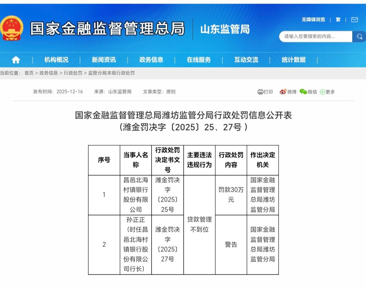 近日,根据国家金融监督管理总局官网发布的《行政处罚信息公开表》(潍金罚决字〔2025〕25、27号),潍坊监管分局对昌邑北海村镇银行作出行政处罚,认定其主要违法违规事实为“贷款管理不到位”。依据相关监管规定,潍坊监管分局对该行处以罚款30万元。