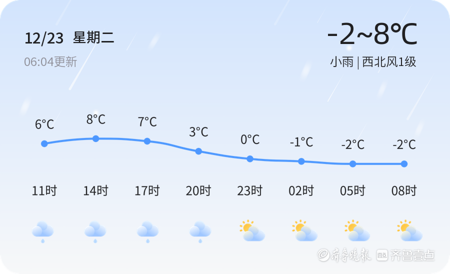 今天是12月23日,星期二,农历十一月初四。济宁市今日天气为小雨,气温在-2℃至8℃之间。全市各区均出现小雨天气,风力较小,西北风1级,空气湿度较高,为96%,PM2.5指数为53,空气质量良好。当前时间为6时04分,实时气温为4.5℃。
