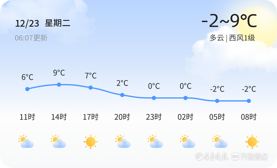 今日是12月23日,星期二,农历十一月初四。菏泽市迎来多云天气,气温在-2℃至9℃之间,西风1级,空气湿度较高,PM2.5值为55,空气质量良好。各区县天气情况基本一致,整体天气平稳,适合市民户外活动。