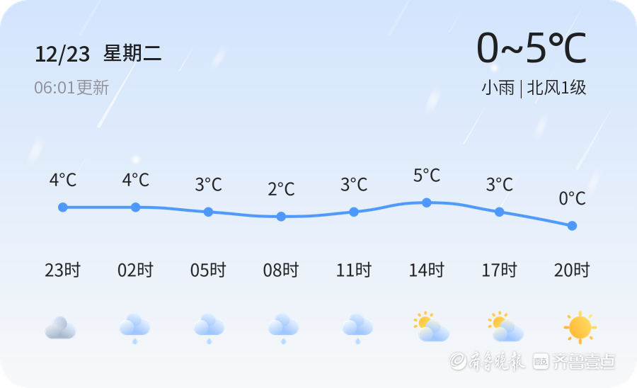 今天是12月23日,农历十一月初四,淄博市迎来小雨天气,气温在0℃到5℃之间。全市各区普遍出现小雨,局部地区有轻微降雨,北风1级,空气湿度高达95%,PM2.5指数为46,空气质量良好。市民出行请注意携带雨具,注意防寒保暖。
