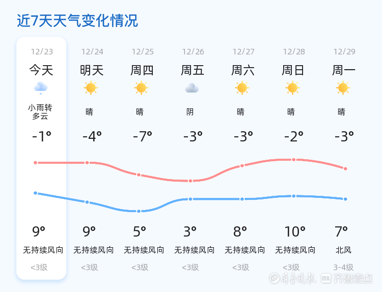 明日(12月24日)枣庄市天气转晴,气温与今日相比变化不大,最低气温为-4℃,最高气温为9℃。风力持续较小,无明显风向,市民可适当减少衣物,但早晚仍需注意保暖。