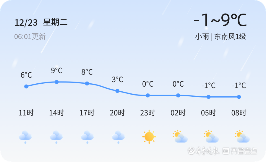 今日(12月23日,星期二,农历十一月初四)枣庄市迎来小雨天气,气温在-1℃至9℃之间波动。全市各区县普遍出现小雨,风力较小,东南风1级,空气湿度较高,达到95%,PM2.5指数为36,空气质量良好。市民在出行时需携带雨具,注意防寒保暖。