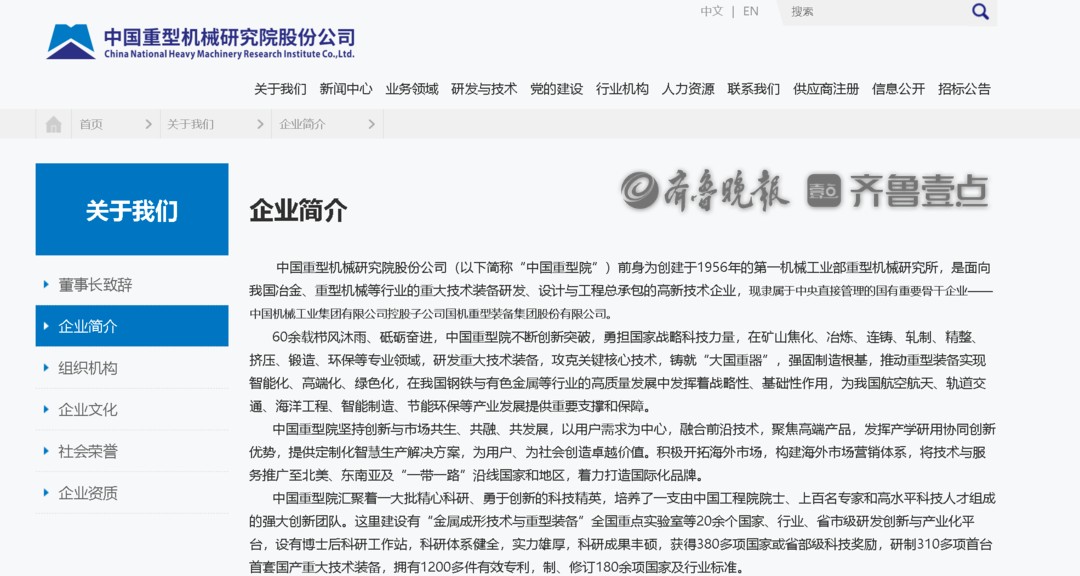 中国重型机械研究院股份公司(以下简称“中国重型院”)前身为创建于1956年的第一机械工业部重型机械研究所,是面向我国冶金、重型机械等行业的重大技术装备研发、设计与工程总承包的高新技术企业,现隶属于中央直接管理的国有重要骨干企业——中国机械工业集团有限公司控股子公司国机重型装备集团股份有限公司。