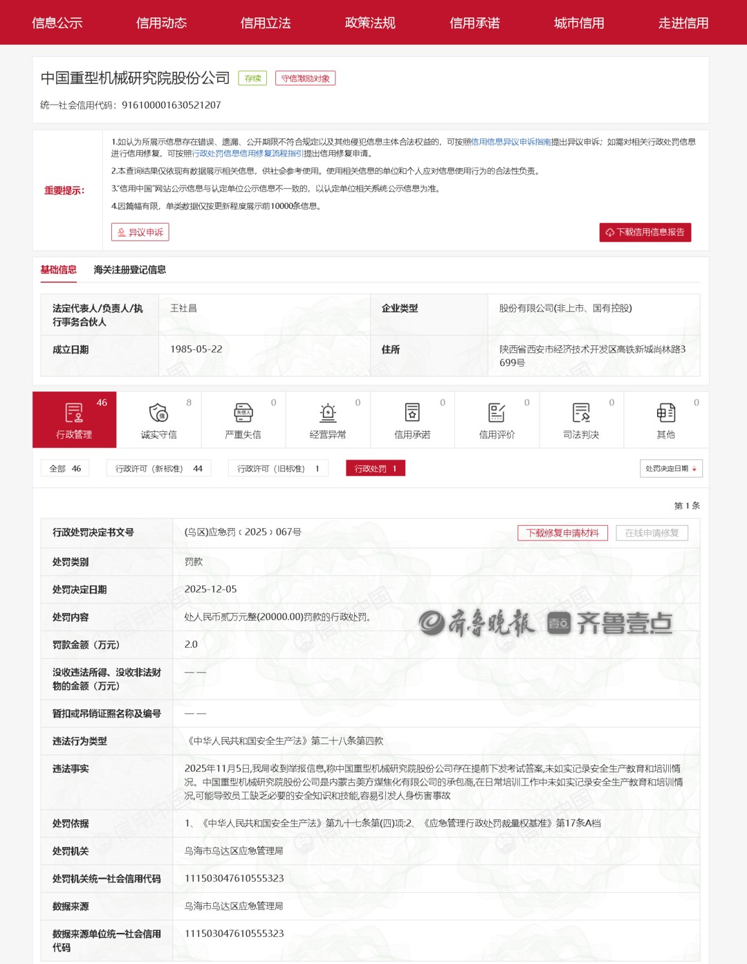 近日,齐鲁晚报·齐鲁壹点记者从信用中国获悉,中国重型机械研究院股份公司因违反《中华人民共和国安全生产法》第二十八条第四款,被乌海市乌达区应急管理局处人民币贰万元整(20000.00)罚款的行政处罚。