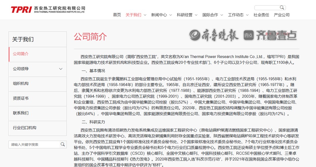 西安热工研究院有限公司(简称“西安热工院”,英文名称为Xi’an Thermal Power Research Institute Co.,Ltd.,缩写TPRI)是我国国家级能源电力技术研发机构和科技型企业。西安热工院设有20个专业技术部门、6个子公司以及3个分公司,现有职工1100余人。
