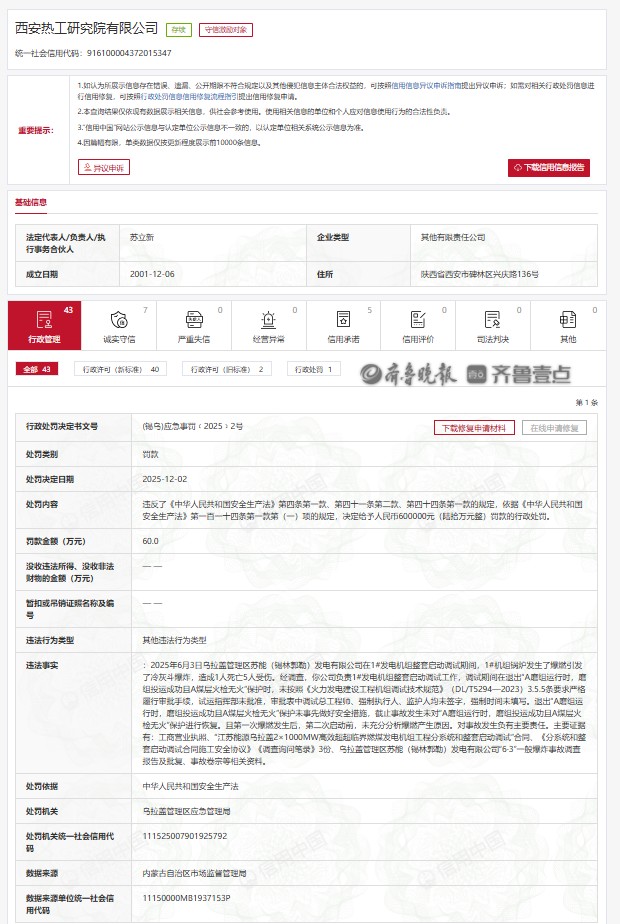 近日,齐鲁晚报·齐鲁壹点记者从信用中国获悉,西安热工研究院有限公司因违反了《中华人民共和国安全生产法》第四条第一款、第四十一条第二款、第四十四条第一款的规定,被乌拉盖管理区应急管理局罚款60万元。