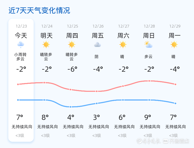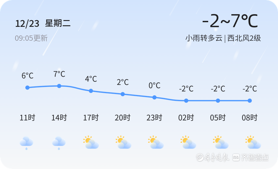 今日是12月23日,星期二,农历十一月初四。临沂市今日天气为小雨转多云,气温范围在-2℃至7℃之间。各区整体天气情况平稳,以小雨和多云为主,风力较小,空气质量良好,PM2.5指数为36。市民出行请注意携带雨具,防范路面湿滑。