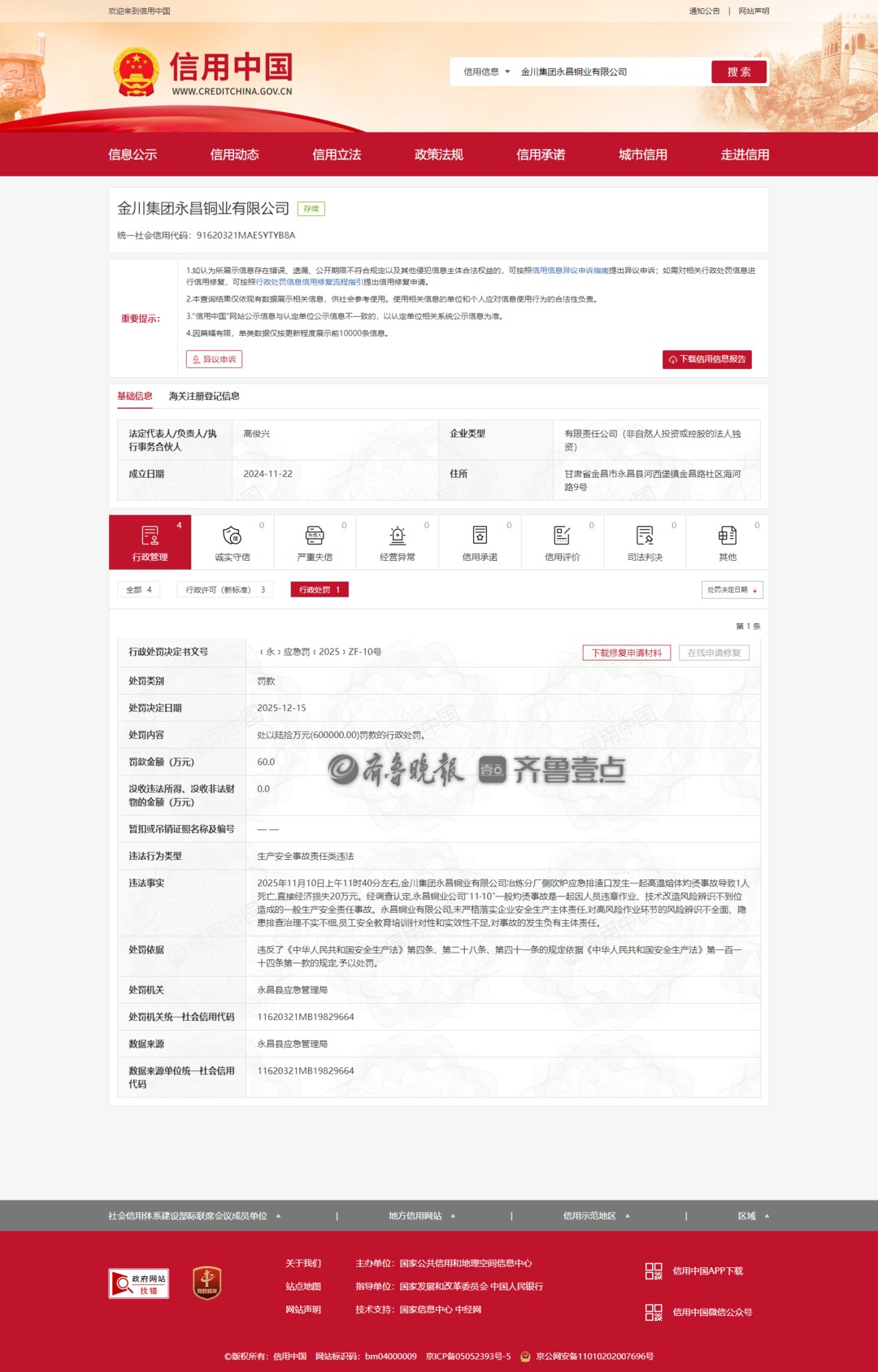 金川集团永昌铜业有限公司因生产安全责任事故被罚60万元