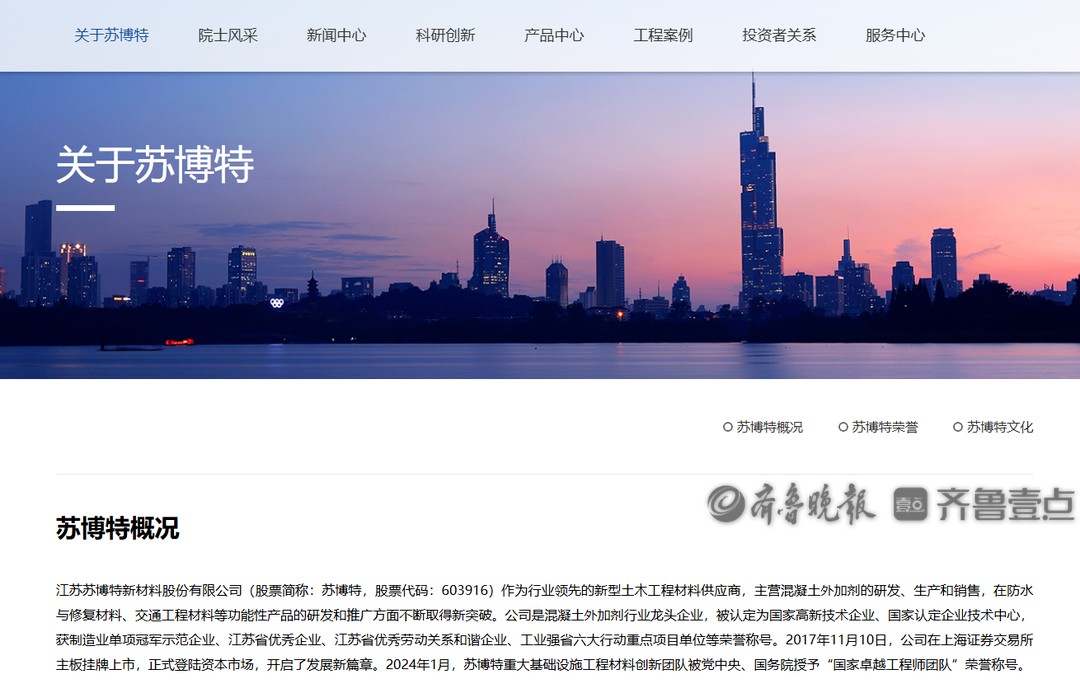 江苏苏博特新材料股份有限公司(股票简称:苏博特,股票代码:603916)主营混凝土外加剂的研发、生产和销售。公司是混凝土外加剂行业龙头企业,被认定为国家高新技术企业、国家认定企业技术中心,获制造业单项冠军示范企业、江苏省优秀企业、江苏省优秀劳动关系和谐企业、工业强省六大行动重点项目单位等荣誉称号。2017年11月10日,公司在上海证券交易所主板挂牌上市。