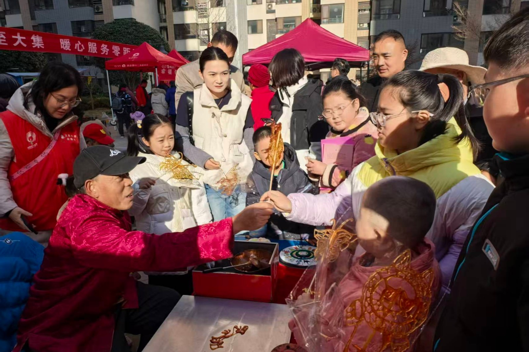 活动现场人头攒动,处处洋溢着温馨的烟火气。美食摊位上,香甜松软的各式面包糕点吸引着居民驻足选购;糖画摊位前更是围满了大人小孩,手艺人以勺为笔、以糖为墨,飞快勾勒出龙、兔、花鸟等栩栩如生的图案,也勾起了大家满满的童年回忆。日用品摊位整齐摆放着各类生活好物,满足居民日常采购需求。
