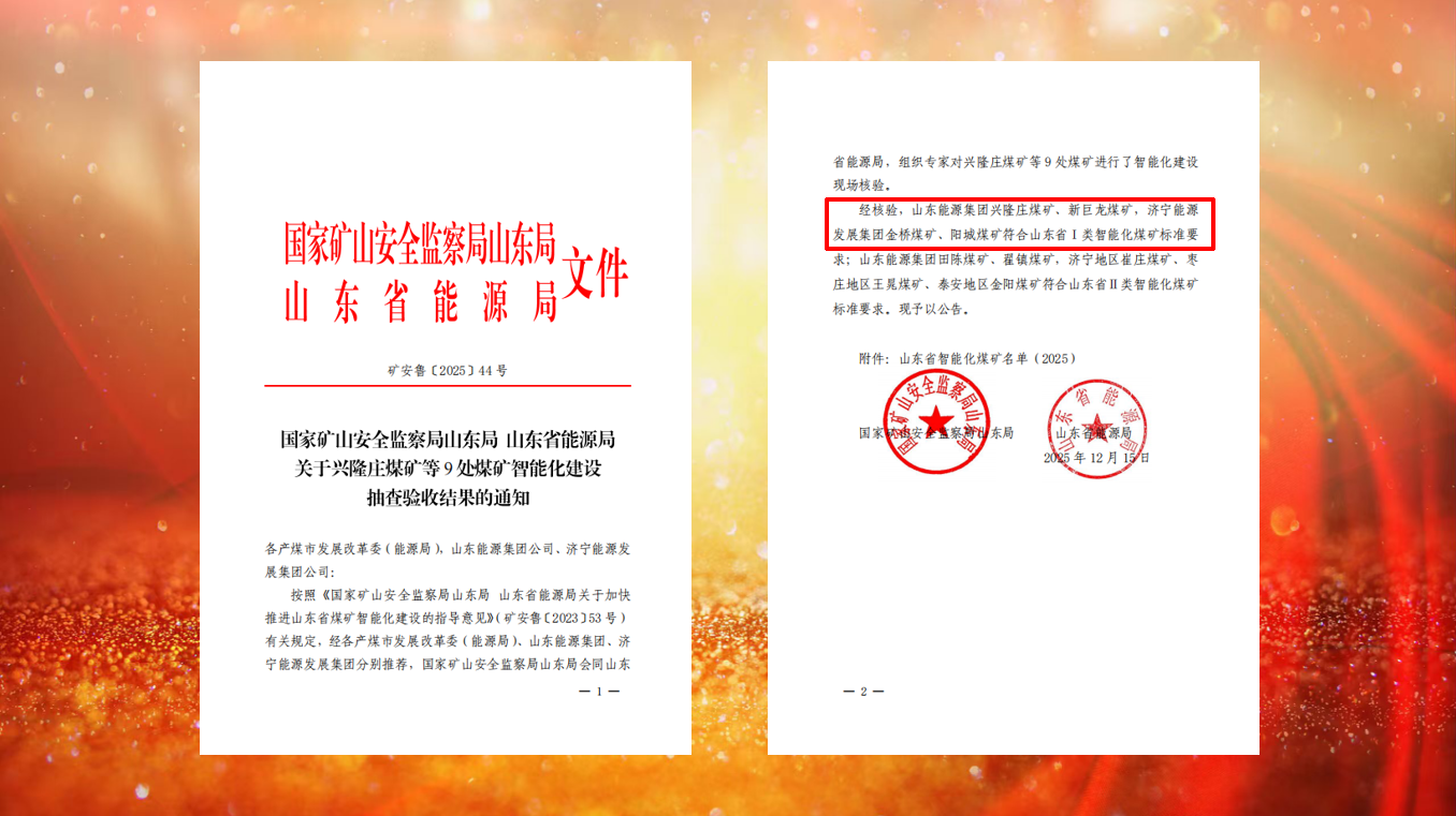 近日,国家矿山安全监察局山东局、山东省能源局联合公布全省煤矿智能化建设抽查验收结果,济宁能源发展集团旗下阳城煤矿、金桥煤矿凭借扎实建设成效顺利通过严格核验,双双获评山东省I类智能化煤矿,标志着集团智能化转型迈上新台阶,旗下矿井核心建设水平跻身全省先进行列。