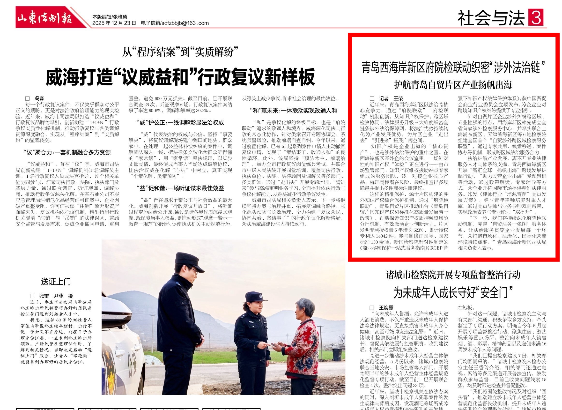 近年来,青岛西海岸新区以法治为核心竞争力,通过“府院联动”“府检联动”机制创新,从知识产权保护、跨区域检察协同、法律服务升级三大维度织密全链条涉外法治保障网,将法治优势持续转化为产业发展优势,为片区企业“走出去”“引进来”拓展广阔空间。