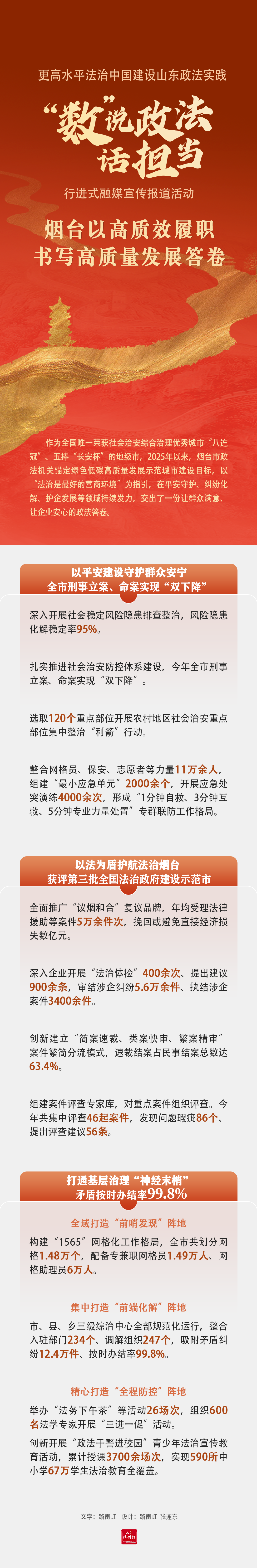 本期,采访团走进这座以“山海仙境”闻名、向新时代现代化强市迈进的城市。从自贸区法庭内高效化解的商事纠纷,到社区里温情落幕的供暖矛盾,从反诈专班守护的群众“钱袋子”,到检察护企站精准推送的法治服务……在烟台,政法机关的担当作为清晰可感,平安法治的坚实底色愈发鲜明。