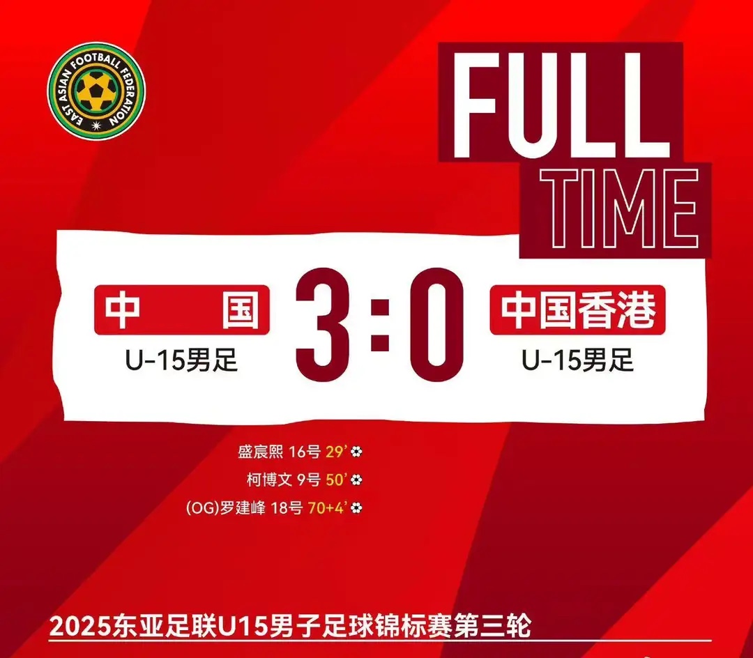 12月22日,2025东亚足联U15锦标赛在福建漳州结束最后一轮比赛,A组的中国U15男足3:0战胜中国香港队,以一胜一平一负的战绩结束本届赛事。