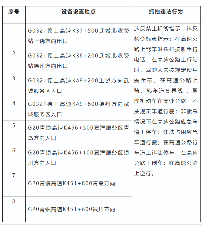 为进一步加强高速公路交通安全管理,规范行车秩序,预防和减少道路交通事故发生,依据《中华人民共和国道路交通安全法》《中华人民共和国道路交通安全法实施条例》等法律法规,德州市公安局交通管理支队高速夏津大队拟对8处交通技术执法取证监控设备进行公示,自本公示5个工作日后,将对有关交通违法行为进行依法管理,请广大交通参与者自觉遵守道路交通法律法规,共同维护良好的道路交通环境。