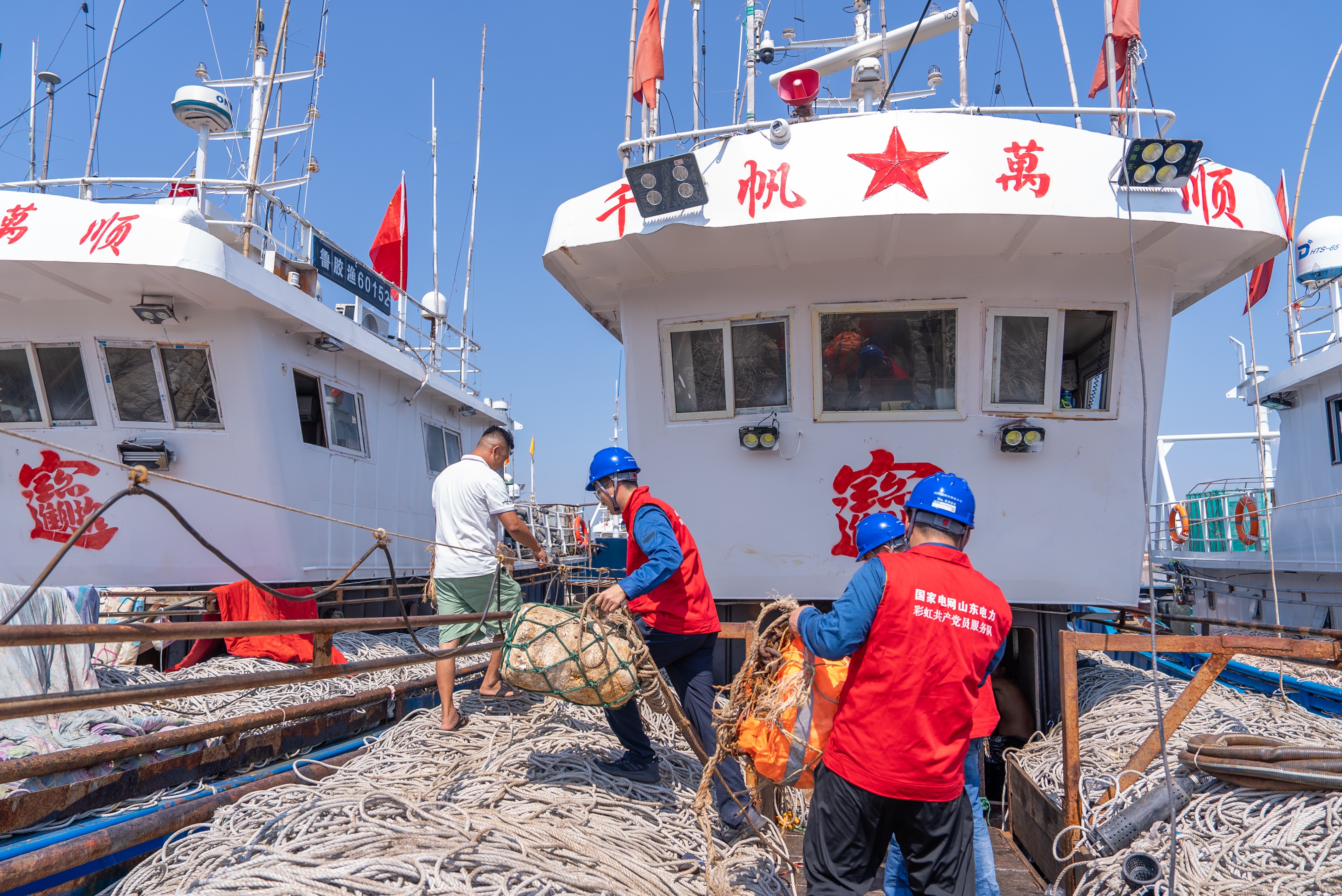 国网胶州市供电公司青年志愿者“开海”前帮助渔民做好出海物资准备