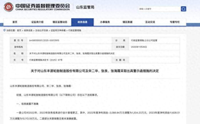 11月28日,山东证监局发布的行政监管措施决定显示,丰源轮胎存在两大核心违规事项。信息披露层面,公司对2022年、2023年财务数据进行会计差错更正:2022年净利润从最初披露的亏损3088.84万元,修正为盈利1204.23万元,实现“扭亏为盈”的惊人变脸;2023年净利润则从1.16亿元下调至1.01亿元,调整幅度达13.02%。更值得警惕的是,部分关联销售交易未按规定准确披露,违背了资本市场信息透明原则。