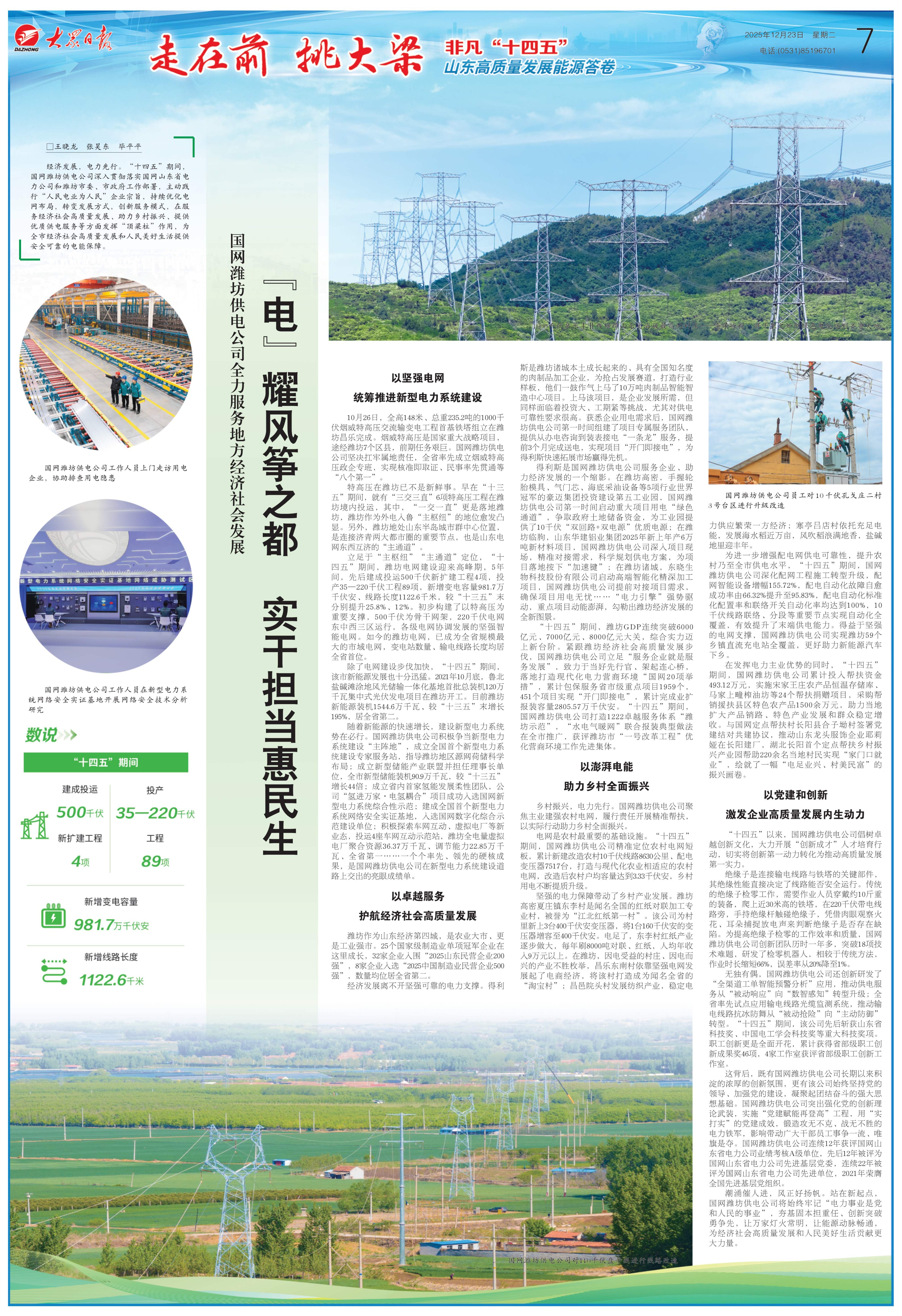 经济发展,电力先行。“十四五”期间,国网潍坊供电公司深入贯彻落实国网山东省电力公司和潍坊市委、市政府工作部署,主动践行“人民电业为人民”企业宗旨,持续优化电网布局,转变发展方式,创新服务模式,在服务经济社会高质量发展、助力乡村振兴、提供优质供电服务等方面发挥“顶梁柱”作用,为全市经济社会高质量发展和人民美好生活提供安全可靠的电能保障。