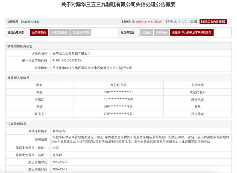 同日,同属于际华集团股份有限公司(际华集团601718.SH)的际华三五三九制鞋有限公司因在参加项目编号:2022-JQ01-W1491/W1520、项目编号:2017-ZHTJ-2056、项目编号:2020-WZ-LB05-2006采购活动中,存在履约不当等违规行为,被联勤保障部队采购管理部门禁止其1年内参与全军物资工程服务采购活动。